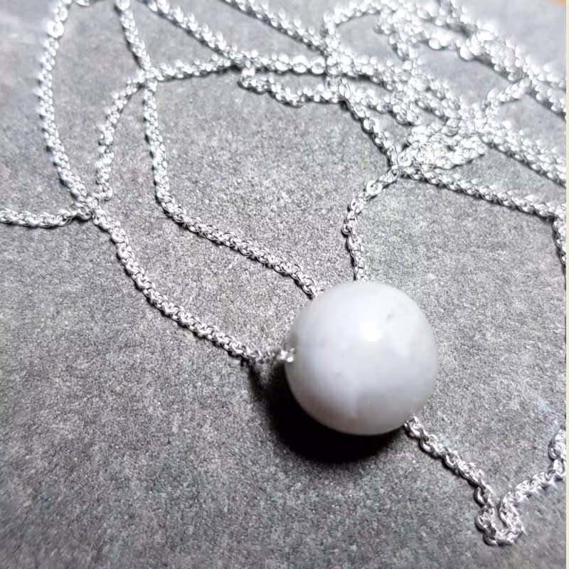 Handgjort silverhalsband med pärla av vacker vit/beige agat. Tunt silverhalsband med sober känsla där skiraste silverkedja kombineras med en 8mm pärla av agat i härligt mjuka vit/beiga toner. Denna agat i levande ljusa skiftningar ger ett mjukt och harmoniskt intryck. Halsbandet är vackert att bära som solitär, passar även mycket fint tillsammans med exempelvis silverhalsband Grain of sand eller varför inte det längre halsbandet Flow of nature ?