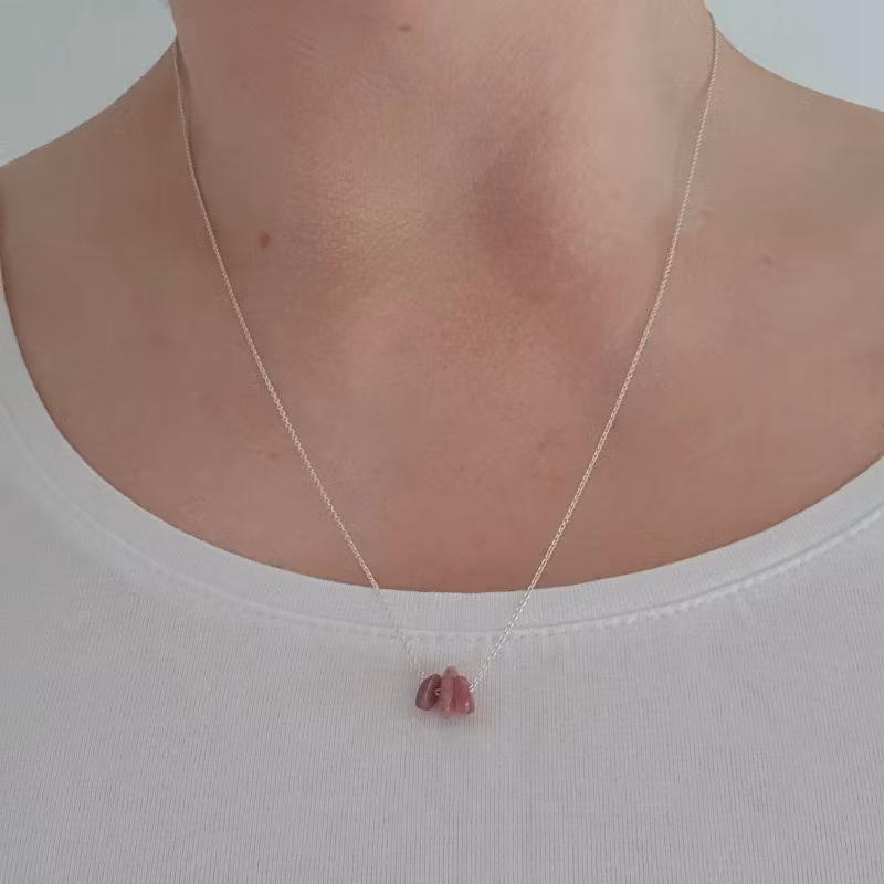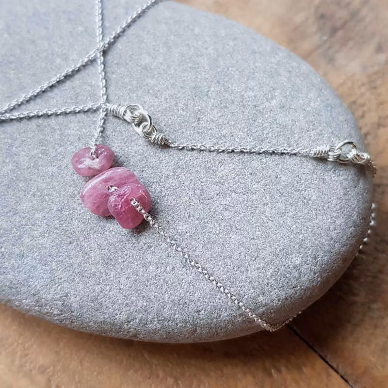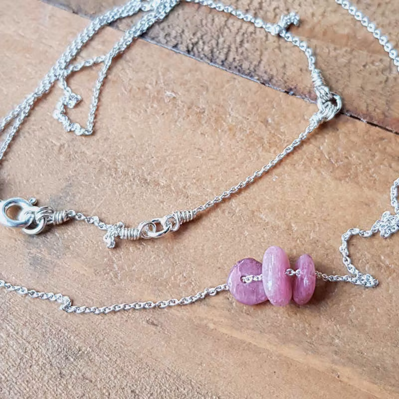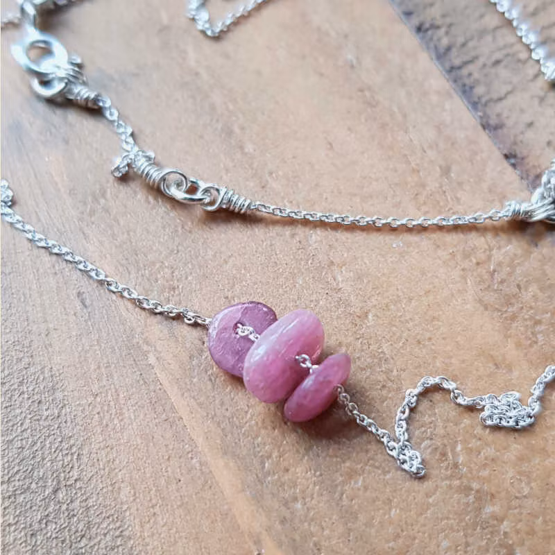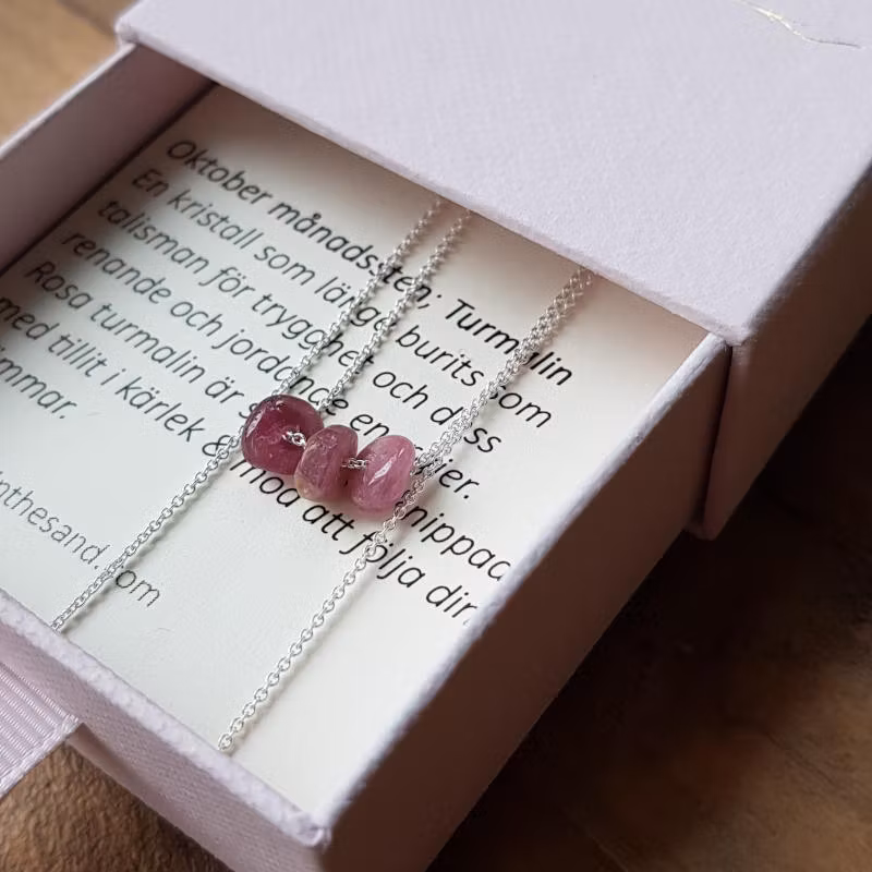 Handgjort silverhalsband med oktober månadssten turmalin som skiftar vackert i rosa nyanser. Skir silverkedja och tre mindre kristaller av rosa turmalin vars nyanser går från ljusaste mjukt rosa till mer intensiva nyanser av rosa/lila skapar en härligt levande känsla.