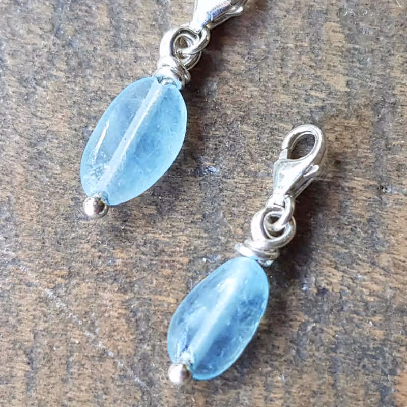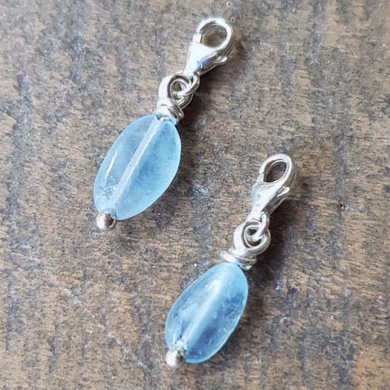 - Liten kristallberlock skapad av tunn silvertråd och liten kristall av akvamarin.