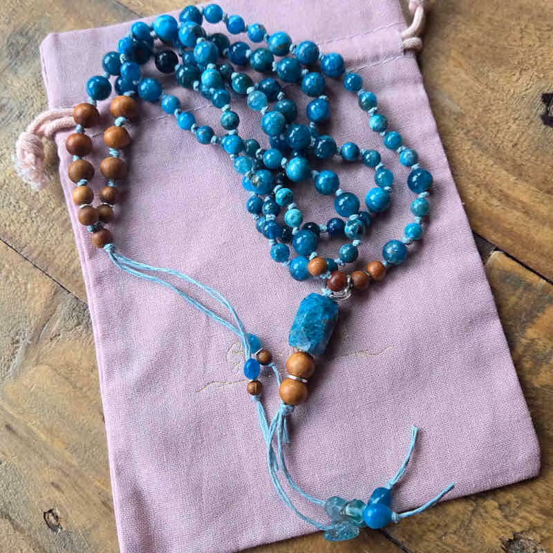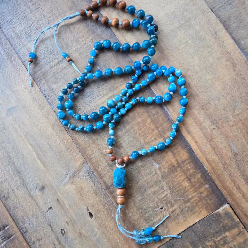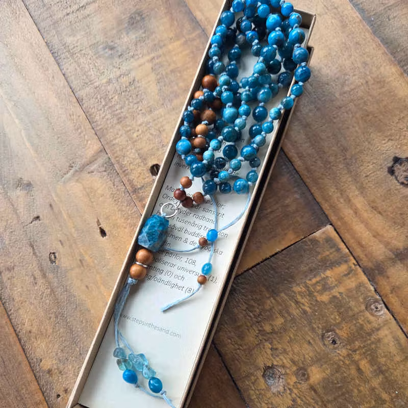 - Mala halsband med 108 pärlor av apatit & sandelträ i 6mm och 8mm.