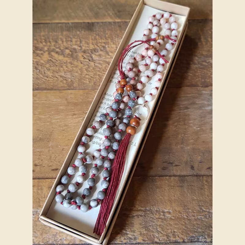 Mala med 108 pärlor: Ordet mala är sanskrit och betyder radband. Har en tusenårig tradition inom såväl buddismen, hinduismen & den yogiska filosofin. Antalet pärlor, 108 symboliserar universum (1), ingenting (0) och allting/oändlighet (8).