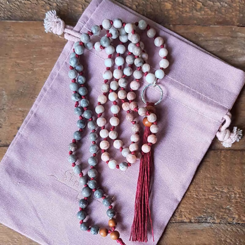 - Mala halsband med 108 pärlor av rosa zebra jaspis 6mm, detaljpärlor i ljus sandelträ.