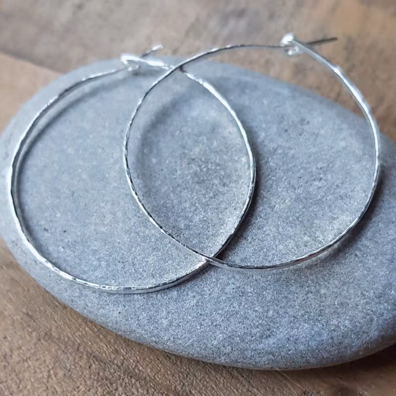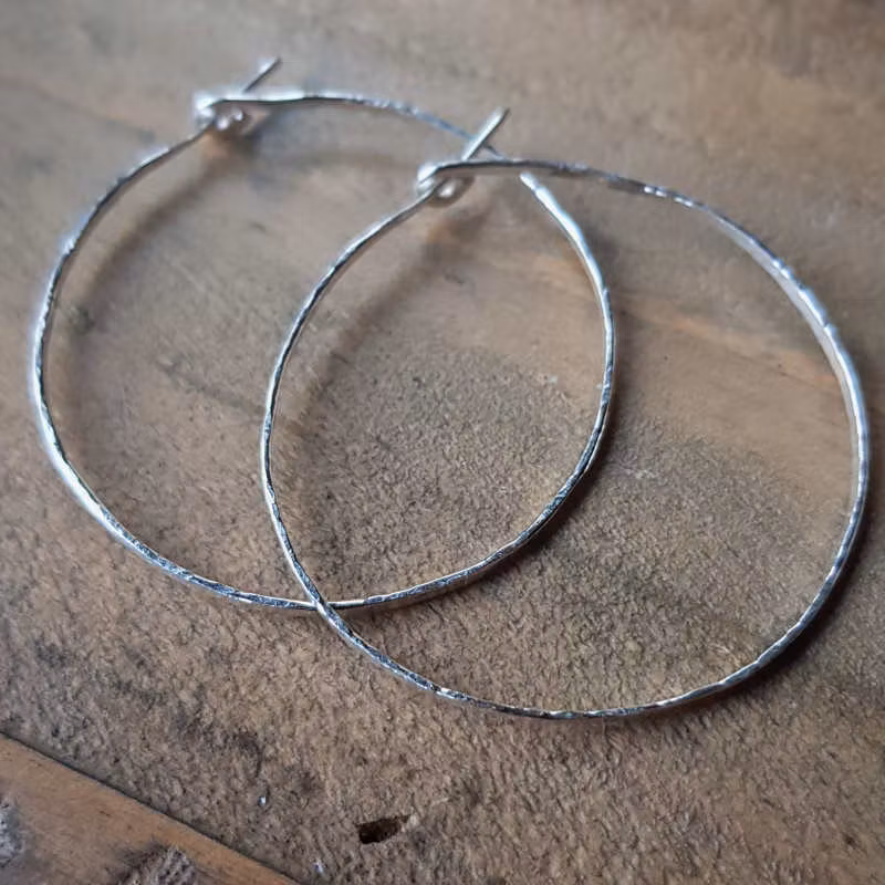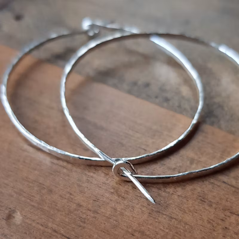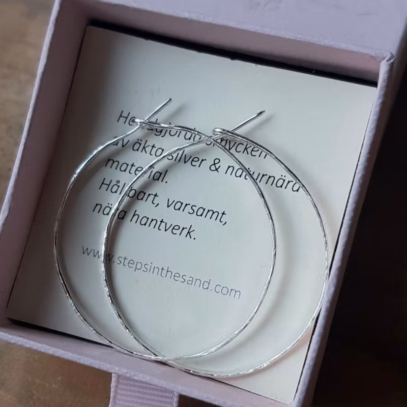 Härliga hoops i olika storlekar som jag format för hand av återvunnet silver. Smidda i ett stycke med lätt hamrad yta. Det genuina hantverket uttrycker känslan. Nätta & behagliga att bära. Skickas i fin smyckeask. Finns just nu i tre storlekar, ett unikt par av varje;