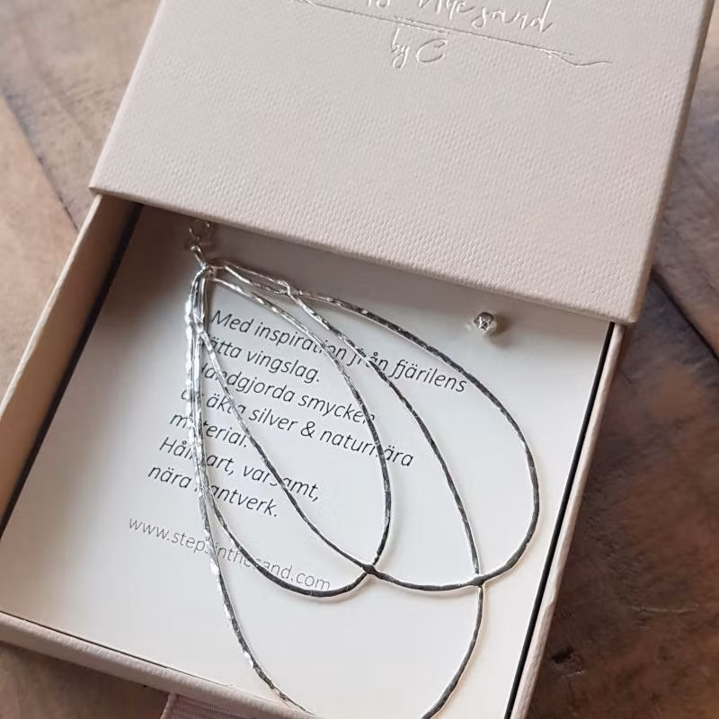 Stort silverörhänge inspirerat av fjärilens lätta vingslag. Till örhänget ingår ett litet stud-örhänge, så du bär det stora örhänget i ena örat och den lilla studen i andra.