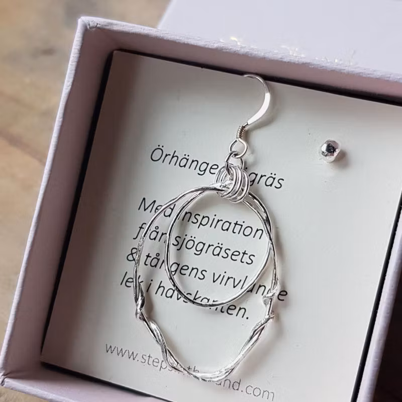 Örhänget skickas i fin smyckeask. Dessa örhängen är en del av kollektionen Sjögräs, där även det större örhänge Sjögräs stor ingår.