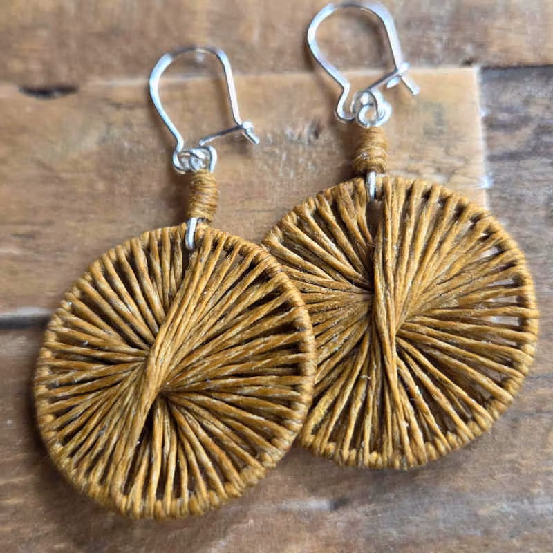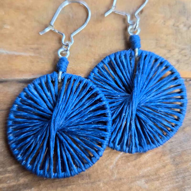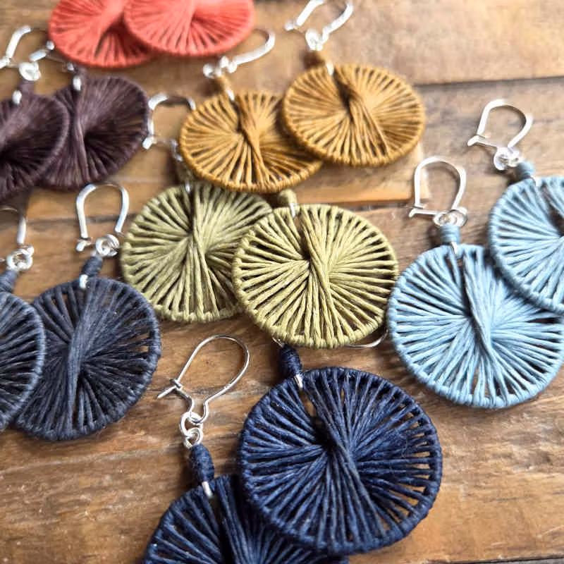 Först skapar jag en stomme av silvertråd, sedan växer örhängets mönster fram då jag tvinnar med lingarnet över formen. Finns just nu ett exemplar av vardera nyans; umbra, oliv, kakao, grafitgrå, ljusblå, mellanblå, midnattsblå & en vacker röd/orange nyans jag valt att kalla våreld.